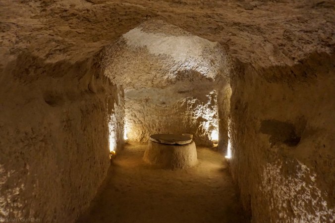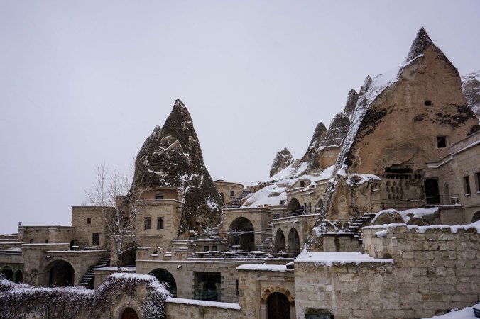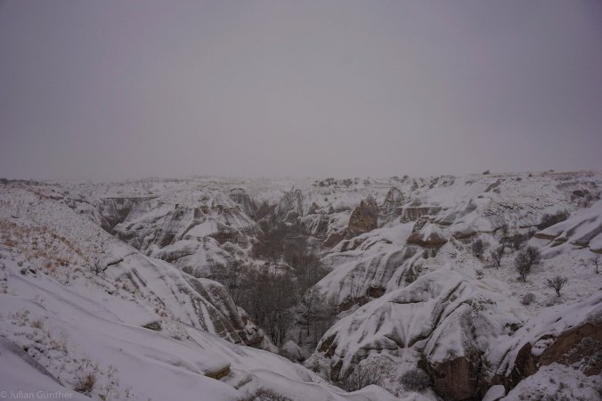 Jedoch war das Wetter schneller als wir und wir besuchten die kleine Stadt Göreme um einen Tag Pause zu machen. Göreme liegt in der Gegend von Kappadokien und ist bekannt durch seine Felsformationen, in denen die Bewohner ihre Häuser gebaut haben. Auch unser Hostel hatte einen Raum, der einfach in den Felsen gehauen wurde. Der Pausentag war gut gewählt, denn es schneite den ganzen Tag.